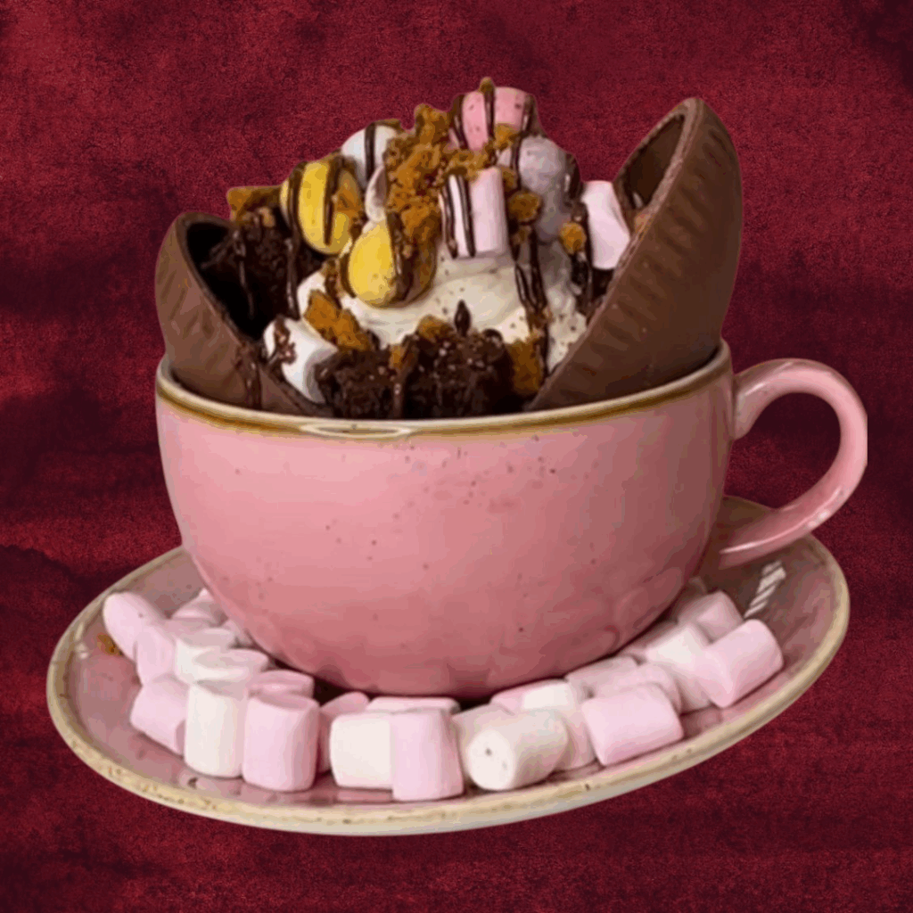 Ovo de páscoa com duas cascas de chocolate, recheio cremoso e docinhos. Montado em caneca de porcelana.