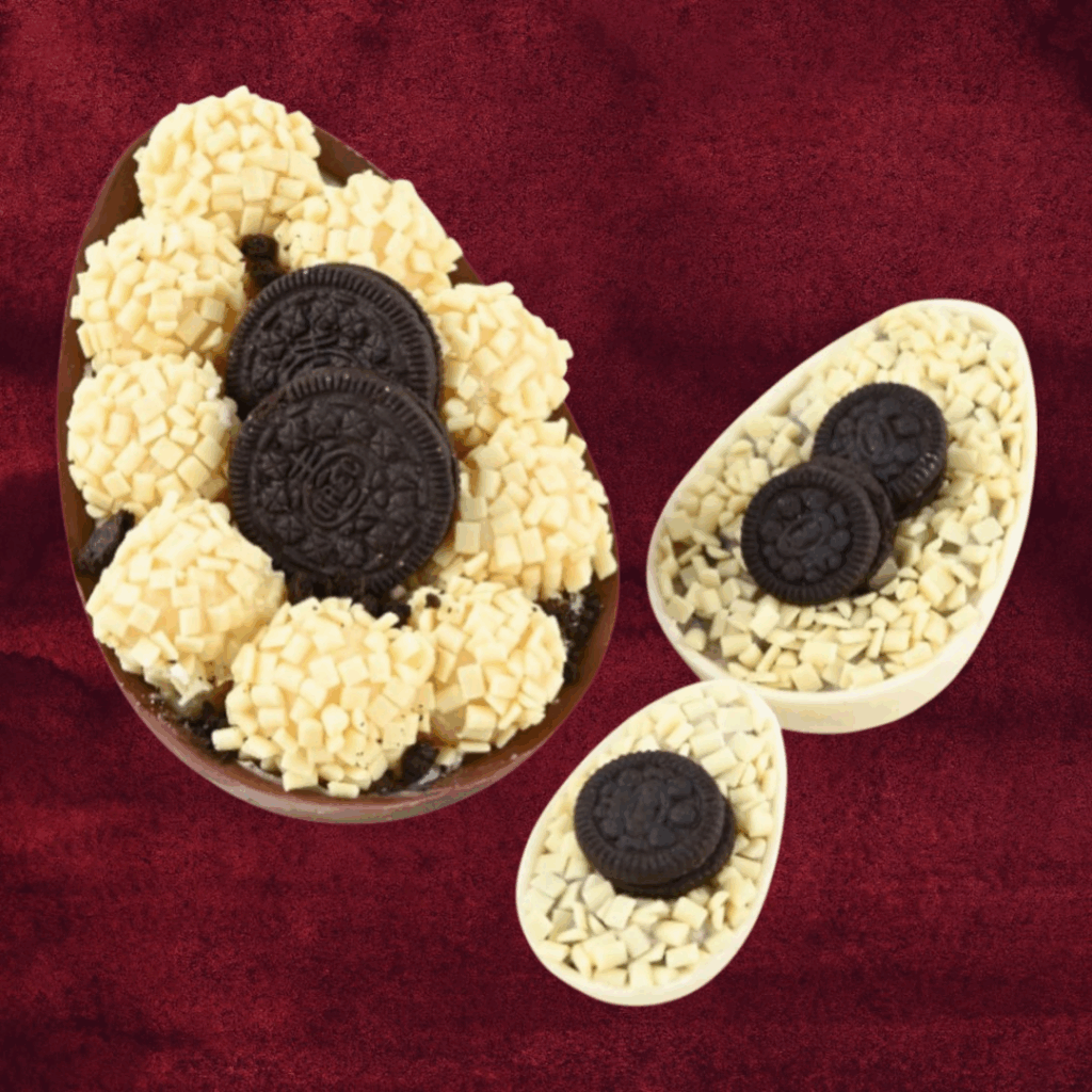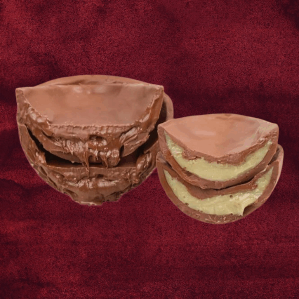 800gr – casca de chocolate ao leite ou branco com recheio (Ninho, chocolate, oreo)