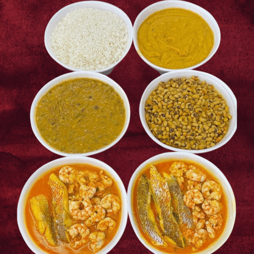 02 kg proteínas (moqueca de banana com camarão, moqueca de peixe, bobó de camarão)